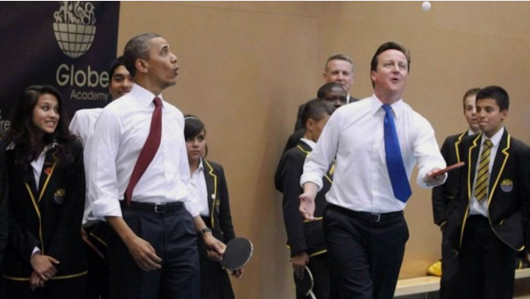 في عام 2012 اهدى كاميرون طاولة تنس للرئيس الأمريكي وذلك في ذكرى انشاء هذه اللعبة وكانت الطاولة صنعت في بريطانيا كأجود أنواع الطاولات المصنعة في العالم