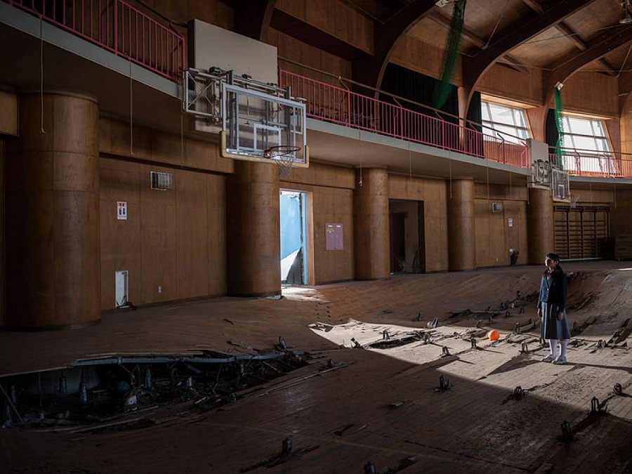 صورة لنادي رياضي دُمر بسبب الزلزال والمفاعل النووي.