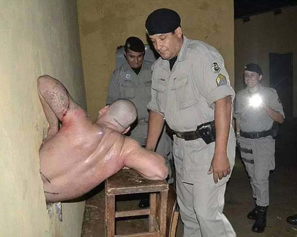 السجين رافائيل فالادو وضع نفسه في موقف محرج أمام الشرطة بعد أن أمسكوا به عالقًا في فتحة في جدار السجن بينما كان يحاول الهرب من سجن في سيريس، البرازيل!