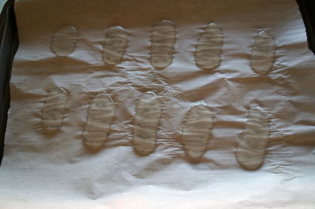 سخِّن الفرن وقم بسكب الهلام في صينية بشكل بيضاوي يشبه إلى حد كبير رقائق البطاطس، وضعها في الفرن. في الحقيقة، فإنها بحاجة لأن تُوضع في الفرن لمدة من 8-10 ساعات.
