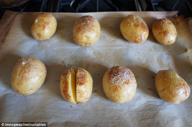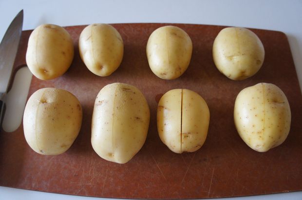في البداية قم بتجهيز بعض حبات البطاطس، واصنع شق في المنتصف (بعمق 1 سم فقط).