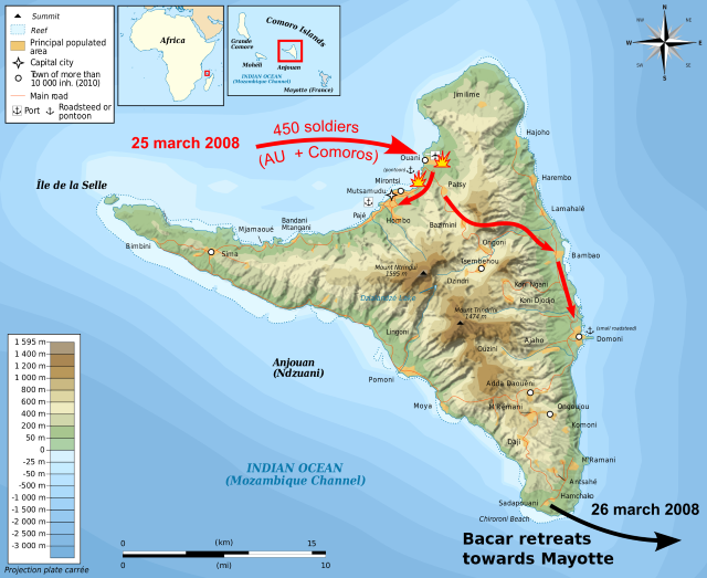 القتال بين حكومة جزيرة كوروموس وجزيرة أنجوان الانفصالية الصغيرة في مارس عام 2008م، استغرق يومين فقط قبل أن ينتهي الصراع مثلما بدأ. فقد واجه الاتحاد الأفريقي وكوروموس عصابة من المتمردين مكونة من نحو 500 متمرد في جزيرة أنجوان المستقلة الصغيرة في المساحة.