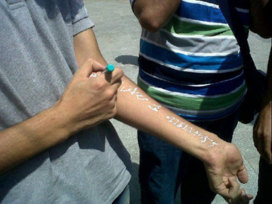 متظاهرين يكتبون بياناتهم على ايديهم حتى يتم معرفتهم اذا تم قتلهم