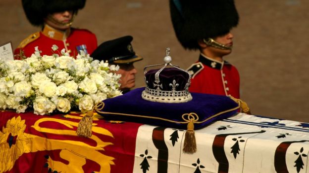زينت الماسة تاج الملكة الأم، ووضعت على نعشها أثناء جنازتها