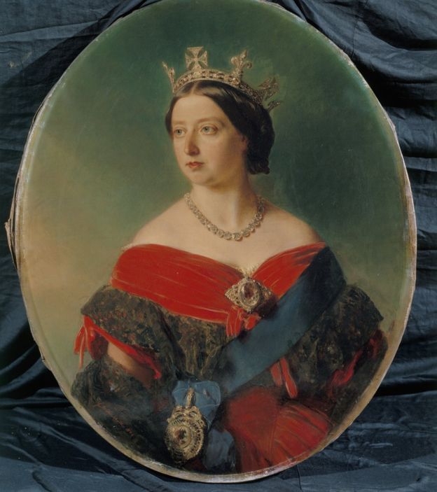 الملكة فيكتوريا وهي ترتدي قطع من الحلي تحمل إحداها ألماسة "جبل النور"