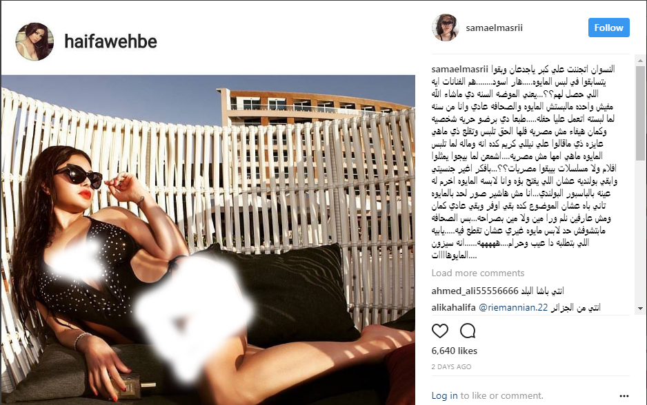 المصري معروفة بإثارتها للجدل بتصرفاتها واطلالتها، استغلت الفرصة لتنتقم لنفسها من الانتقادات التي طالتها منذ سنة عندما نشرت صوراً لها بـ"البيكني"، وأعادت نشر صورة لهيفا بلباس البحر، وأرفقتها بتعليق: "النسوان اتجننت على كبر يا جدعان ويتسابقوا في لبس المايوه، نهار اسود، هنّ الفنانات ايه اللي حصل لهم؟ يعني الموضه السنه دي ما شاء الله مفيش واحدة ما لبستش المايوه".