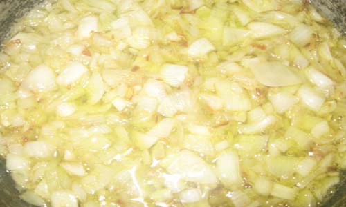 في هذه الأثناء نكون قد حضرنا البصل المقشر والمفروم ناعما ووضعناه في طنجرة للقلي ، ونتركه حتى الإستواء .