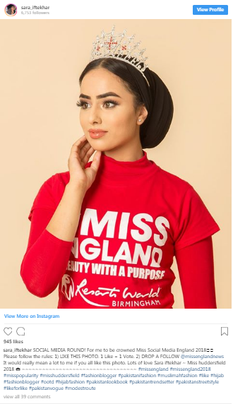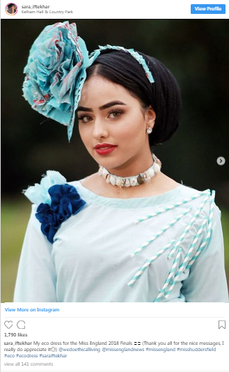 ولأول مرة في تاريخ المسابقة، وصلت سارا افتخار، طالبة القانون البالغة من العمر 20 عاماً، إلى المرحلة النهائية من مسابقة ملكات جمال انجلترا يوم الثلاثاء، لتصبح أول امرأة محجبة تتنافس في النهائيات على تاج الجمال.