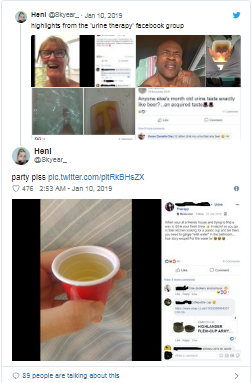 جي بي سي نيوز: يعد فيسبوك موقعا مثاليا لأولئك الذين يعانون من حالات نادرة أو اهتمامات خاصة وغريبة، شمل آخرها ادعاء امرأة في مجموعة مغلقة على الشبكة الاجتماعية بأن شرب البول "صحي ومفيد".