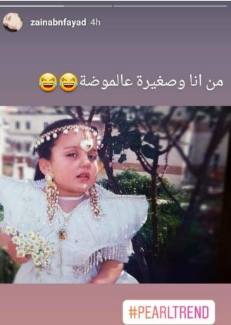 وتظهر الشابة في الصورة بفستان ابيض مع كمية كبيرة من الاكسسوارات من الذهب واللؤلؤ موزعين على رأسها ورقبتها واذنيها، وعلقت عليها بطريقة طريفة: "من انا وصغيرة عالموضة"، في اشارة الى انها تهتم للموضة والدكورات وتحرص دائما على اظهار هذا الجانب من شخصيتها من خلال ترتيب منزلها واناقة طفلتيها.