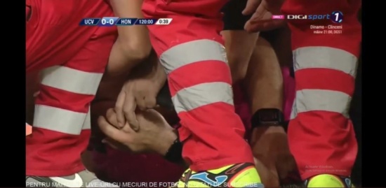 وتسبب أحد تلك المقذوفات في إصابة الحكم الرئيسي، وهرعت سيارة الإسعاف لنقله إلى خارج الملعب، وهو ما تسبب في توقف المباراة لأكثر من نصف ساعة، قبل أن يتولى الحكم الرابع قيادة المواجهة والإشراف على تنفيذ ركلات الترجيح التي ابتسمت للنادي الروماني.