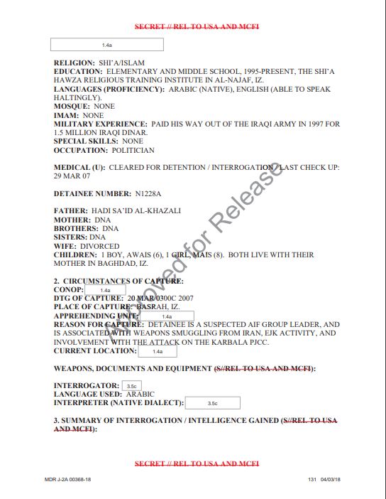 واعتقلته القوات الأميركية على خلفية اتهامه بقيادة ميليشيات معادية للقوات متعددة الجنسيات في العراق بقيادة الولايات المتحدة، وتورطه في تهريب الأسلحة من إيران، وجرائم القتل خارج نطاق القضاء، واقتحام مجلس محافظة كربلاء (في 2007)."، وفق التحقيقات التي رفعت القيادة المركزية للولايات المتحدة "سينتكوم" عن سريتها في 2018.