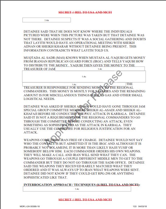 وأقر الخزعلي خلال التحقيقات، بأن أعضاء جيش المهدي الذي يقوده زعيم التيار الصدري مقتدى الصدر وكتائب حزب الله قد تلقوا تدريبا ودعما عسكريا من مصادر إيرانية، إضافة إلى تلقي أعضاء منظمة بدر تدريبات في إيران.