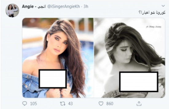 وظهرت انجي خوري على تويتر وهي عارية الصدر وتقول : كورونا شو اخبارها ؟ .