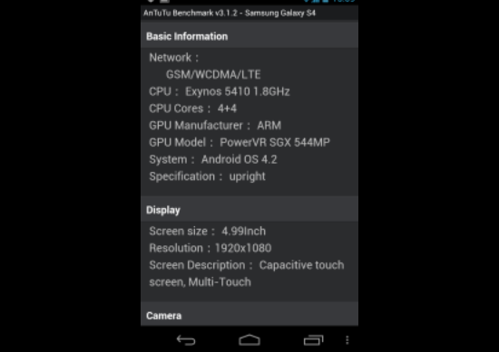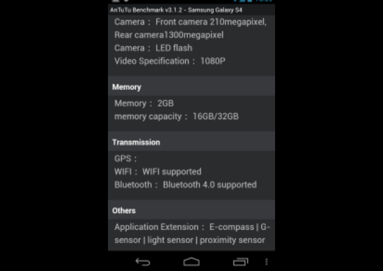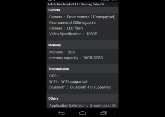 جى بي سي - تسربت صور من أحد الأشخاص لإختبارات Antutu على جهاز Galaxy S4 أظهرت بعضا من المواصفات التي تطابق الإشاعات المنتشرة في الأيام الحالية .