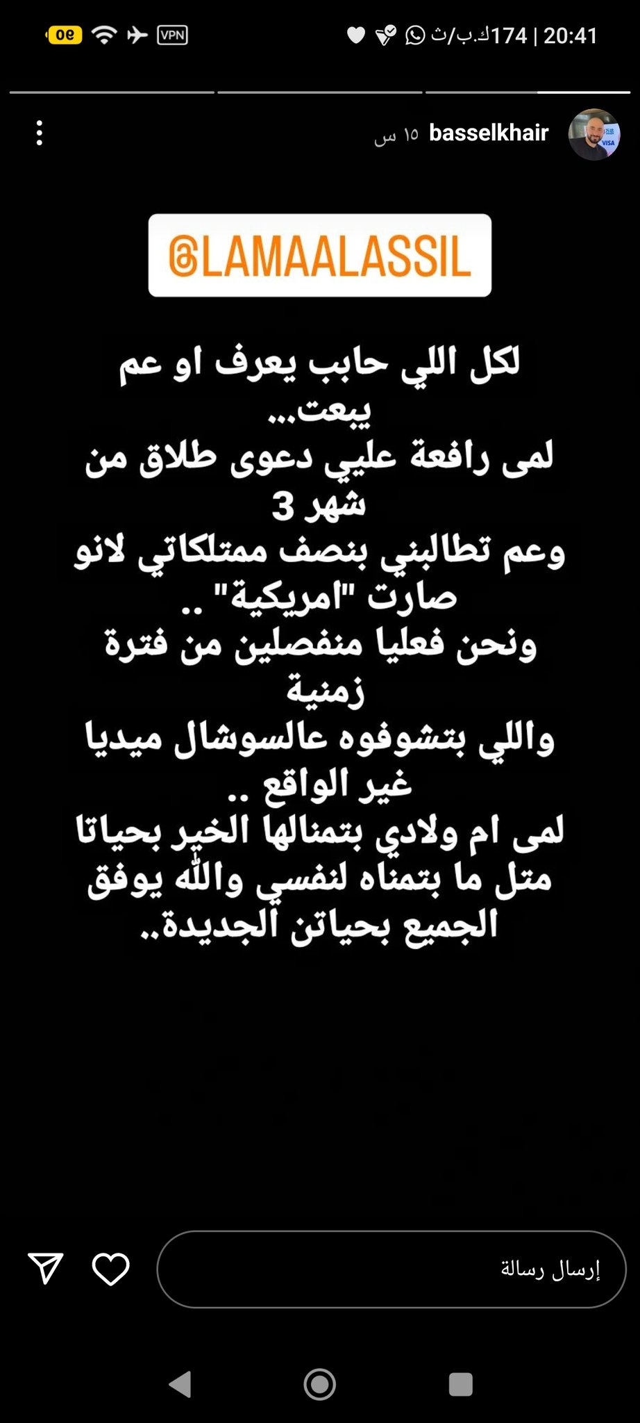 في الجهة الأخرى، تحدث باسل خير عبر حسابه على “إنستغرام” وكشف حقيقة الأمر، وقال إن لمى رفعت عليه دعوى طلاق منذ 3 أشهر، وأنها تطالب بنصف ثروته بحكم أنها حصلت على الجنسية الأمريكية.